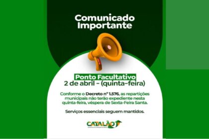 Não haverá atendimento administrativo nos órgãos da administração direta e indireta A Prefeitura de Catalão informa que, conforme o Decreto nº 1.576, haverá ponto facultativo nas repartições públicas ...