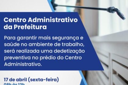 Para garantir mais segurança e saúde no ambiente de trabalho, será realizada uma dedetização preventiva no prédio do Centro Administrativo. 📅 17 de abril (sexta-feira) ⏰ 08h às 13h Atendimento ao públ...