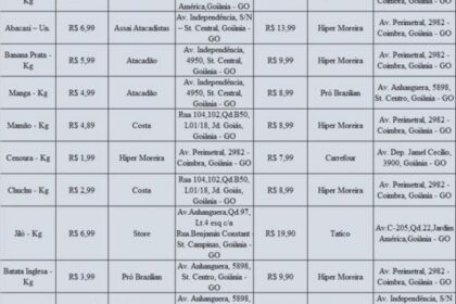 O Procon Goiânia realizou, entre os dias 13 e 16 de março de 2026, uma pesquisa de preços de produtos de hortifrute em diferentes estabelecimentos comerciais da cidade. Foram pesquisados 20 itens, sen...