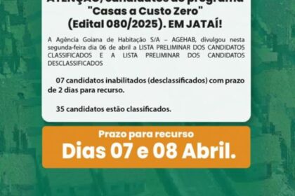 A Agência Goiana de Habitação S/A AGEHAB, divulgou nesta segunda-feira dia 06 de abril a LISTA PRELIMINAR DOS CANDIDATOS CLASSIFICADOS E A LISTA PRELIMINAR DOS CANDIDATOS DESCLASSIFICADOS, referente a...