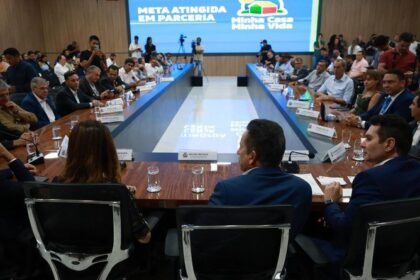 O ministro das Cidades, Jader Filho, esteve na capital mato-grossense para comemorar o momento e realizar novas entregas para o estado Marcelo Camará/MCID Ato comemorou a meta batida, de 40 mil casas ...