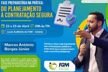 A Federação Goiana de Municípios (FGM) realiza, nos dias 22 e 23 de abril, a partir das 9h, no auditório da entidade em Goiânia, a capacitação “Fase Preparatória na Prática: do Planejamento à Contrata...