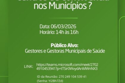 A Secretaria de Estado da Saúde de Goiás (SES-GO), por meio da Gerência de Saúde Mental, realizará no dia 6 de março de 2026, das 14h às 16h, reunião técnica com gestores municipais e equipes da área ...